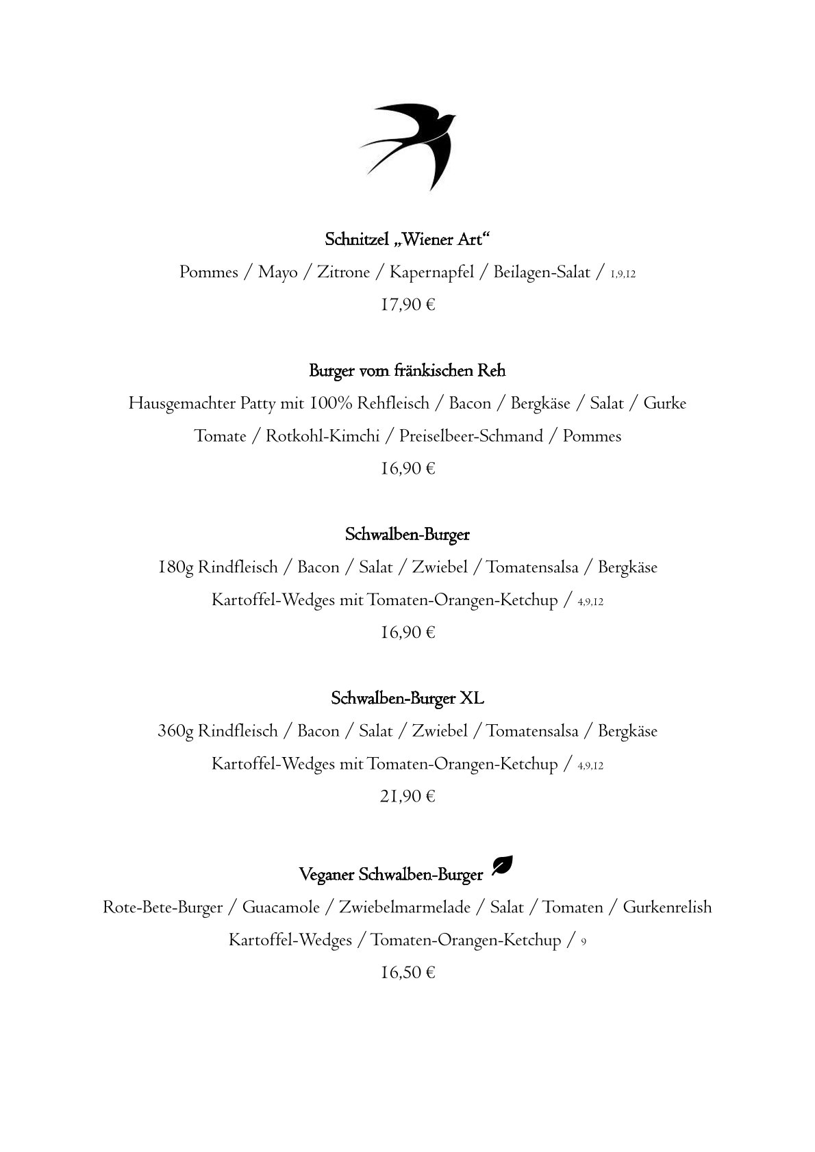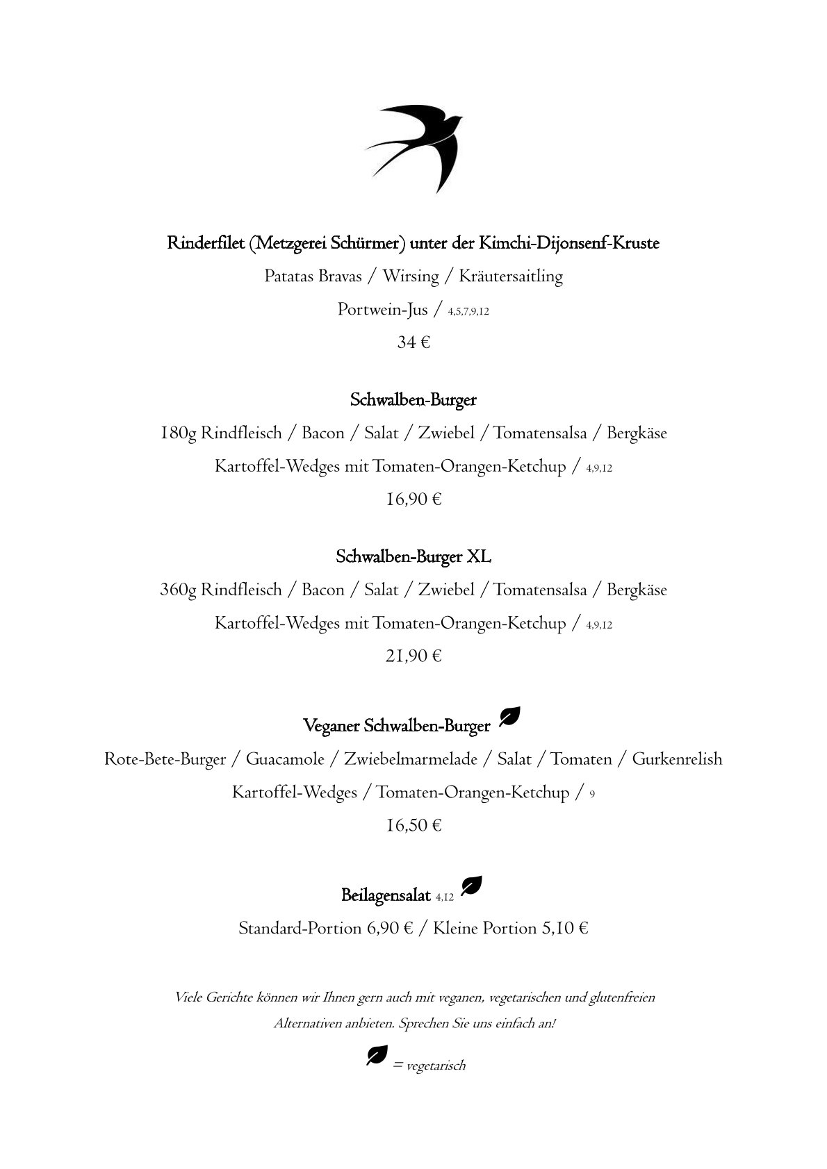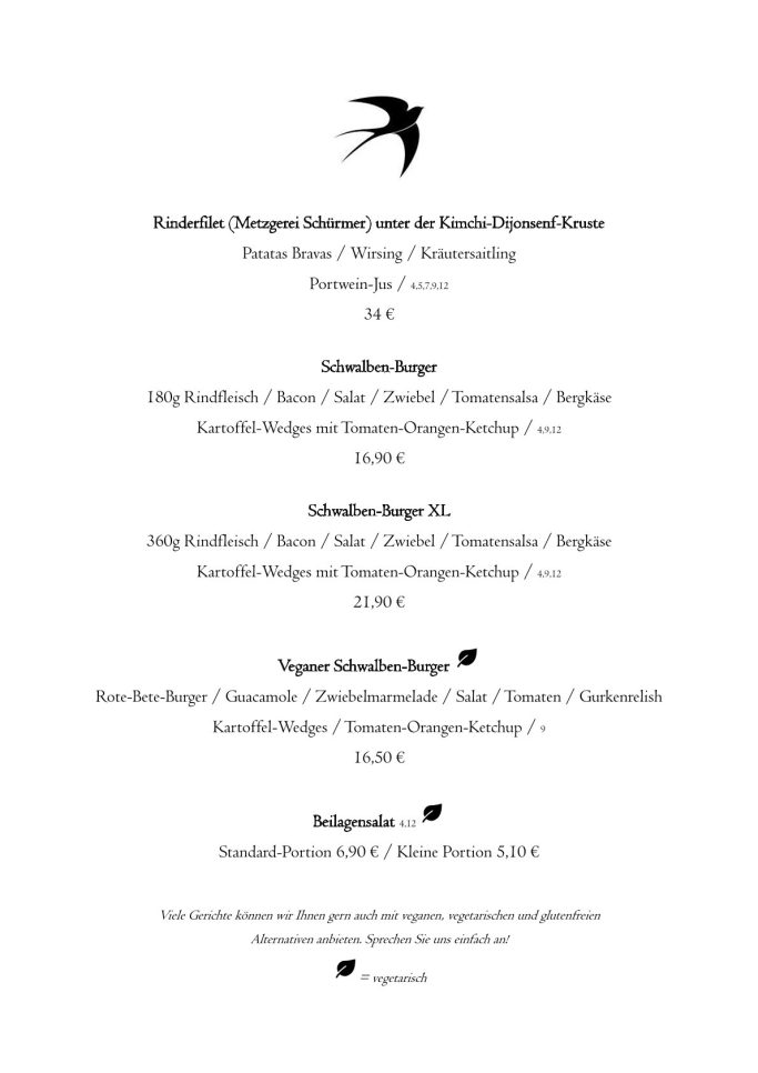 Wir bieten Euch leckere Suppen, knackige Salate, Pasta, Vesperteller, Hausmannskost, und unsere - jetzt schon legendären - Schwalben-Burger in L und XL, gern auch vegan. Wir wechseln die Karte in regelmäßigen Abständen, so dass Ihr immer wieder neue Gerichte entdecken und ausprobieren könnt. Vom klassischen Rinderfilet, über fangfrischen Fisch bis hin zu Wildgerichten findet Ihr ganz sicher Euer neues Lieblingsgericht!